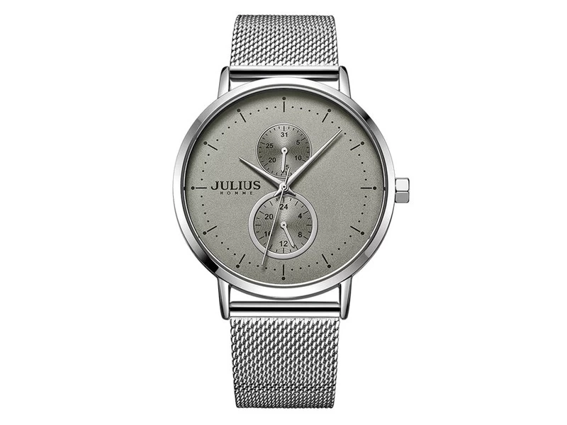 ساعات جوليوس من افضل براندات الساعات الكورية، ومن أشهر علامة تجارية لساعات اليد العصرية في كوريا. تصميمها رائع وتنوعها واسع. دع الناس تتكلم عن ساعتك. ساعات جوليوس المتناسقة لإكمال إطلالتك، لتكون جميلة وأنيقة وعصرية على الطراز الكوري. جودة لا تضاهى، مما يساعدكِ على التميز. المواصفات: • الوزن: 0.5 كغ • الماركة / المجموعة: Julius • التصميم: تصميم كوري • الجنس: رجالي • المينا والعلبة • مادة زجاج المينا: زجاج معدني • لون المينا: رصاصي • مقاس الساعة:: 47.5 × 41 مم • شكل الساعة: دائري • لون الساعة: فضي • مادة العلبة: فولاذ مقاوم للصدأ • سُمك العلبة: 10 مم • السوار • مادة السوار: جلد • طول السوار: مقاس حر (قابل للتعديل) • عرض السوار: 20 مم • ألوان السوار: أسود / بني / رمادي / رصاصي • نوع المشبك: مشبك • آلية الحركة • آلية الحركة: كوارتز يابانية Miyota • مقاومة الماء: نعم. تجنب ملامسة البيئات الكيميائية مثل الغسيل والشامبو.
