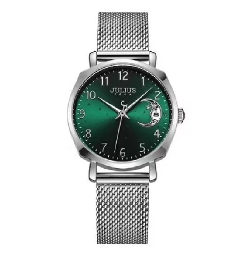 ساعات جوليوس من افضل براندات الساعات الكورية، ومن أشهر علامة تجارية لساعات اليد العصرية في كوريا. تصميمها رائع وتنوعها واسع. دع الناس تتكلم عن ساعتك. ساعات جوليوس المتناسقة لإكمال إطلالتك، لتكون جميلة وأنيقة وعصرية على الطراز الكوري. جودة لا تضاهى، مما يساعدكِ على التميز. المواصفات:- • التصميم: تصميم كوري عصري • الخامة: مصنوعة من مواد عالية الجودة بلون أسود لا يتقشر • الحركة: حركة كوارتز يابانية دقيقة ومتينة من Miyota • العلامة التجارية: أصلية من كوريا، بتصميم أنيق وجودة مثالية • الزجاج: زجاج معدني • الحالة: منتج جديد 100% أصلي، مع ضمان كامل لمدة سنة • عرض المينا: 28 ملم • طول السوار: 210 ملم • عرض السوار: 13 ملم • نوع القفل: قفل مشبك (Clip Lock) قابل للتعديل بسهولة • مزايا إضافية: وظيفة عرض التاريخ مقاومة الماء: نعم. تجنب ملامسة البيئات الكيميائية مثل الغسيل والشامبو.