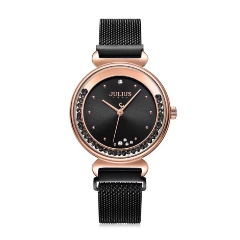 ساعات جوليوس من افضل براندات الساعات الكورية، ومن أشهر علامة تجارية لساعات اليد العصرية في كوريا. تصميمها رائع وتنوعها واسع. دع الناس تتكلم عن ساعتك. ساعات جوليوس المتناسقة لإكمال إطلالتك، لتكون جميلة وأنيقة وعصرية على الطراز الكوري. جودة لا تضاهى، مما يساعدكِ على التميز. المواصفات:- العلامة التجارية: JULIUS تصميم كوري عصري مصنوع من مواد عالية الجودة لون أسود ثابت لا يتقشّر آلية دقيقة ومتينة بحركة كوارتز يابانية Miyota ماركة أصلية من كوريا بتصميم أنيق وجودة مثالية زجاج معدني مقاوم للخدش الأبعاد عرض المينا: 30 مم طول السوار: 150 مم عرض السوار: 15 مم نوع القفل: قفل مغناطيسي – قابل للتعديل بسهولة ذاتيًا ⚠️ يُنصح بتجنب التعرض للمواد الكيميائية مثل مساحيق الغسيل أو الصابون. مقاومة الماء مقاوم لرذاذ الماء وغسل اليدين (غير مناسب للسباحة أو الاستحمام)