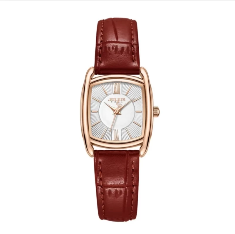 ساعات جوليوس من افضل براندات الساعات الكورية، ومن أشهر علامة تجارية لساعات اليد العصرية في كوريا. تصميمها رائع وتنوعها واسع. دع الناس تتكلم عن ساعتك. ساعات جوليوس المتناسقة لإكمال إطلالتك، لتكون جميلة وأنيقة وعصرية على الطراز الكوري. جودة لا تضاهى، مما يساعدكِ على التميز. المواصفات: • الوزن: 0.5 كغ • الماركة / المجموعة: Julius • التصميم: تصميم كوري • رقم الموديل: JA-1364A, JA-1364C, JA-1364D • الجنس: نسائي • المينا والعلبة • مادة زجاج المينا: زجاج معدني • لون المينا: أسود / أبيض • مقاس العلبة: 23 × 28 مم • شكل العلبة: مربع • لون العلبة: ذهبي وردي (Rose) • مادة العلبة: فولاذ مقاوم للصدأ • سُمك العلبة: 8 مم • السوار • مادة السوار: جلد • طول السوار: مقاس حر (قابل للتعديل) • عرض السوار: 14 مم • ألوان السوار: أسود / بني / رمادي • نوع المشبك: مشبك دبوس • آلية الحركة • آلية الحركة: كوارتز يابانية Miyota • مقاومة الماء: 3 ATM (مقاوم لرذاذ. تجنب ملامسة البيئات الكيميائية مثل الغسيل والشامبو.