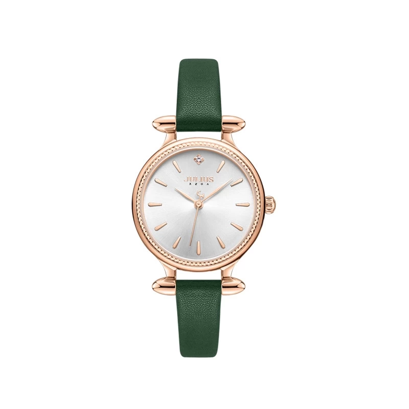 ساعات جوليوس من افضل براندات الساعات الكورية، ومن أشهر علامة تجارية لساعات اليد العصرية في كوريا. تصميمها رائع وتنوعها واسع. دع الناس تتكلم عن ساعتك. ساعات جوليوس المتناسقة لإكمال إطلالتك، لتكون جميلة وأنيقة وعصرية على الطراز الكوري. جودة لا تضاهى، مما يساعدكِ على التميز. المواصفات:- العلامة التجارية: JULIUS مادة السوار: جلد مادة الزجاج: زجاج معدني عالي الجودة، شفاف وواضح، صلابة عالية (مقاوم جيد للصدمات في الاستخدام اليومي) مقاس المينا: 30 مم السُمك: 0.8 سم (8 مم) عرض السوار: 10 مم نوع القفل: مشبك طي (Deployment Buckle) مادة العلبة: سبيكة مطلية باللون الذهبي الوردي بتقنية الطلاء الفراغي المتطور (IP Vacuum Plating) لزيادة اللمعان وثبات اللون آلية الحركة: كوارتز يابانية ⚠️ يُنصح بتجنب التعرض للمواد الكيميائية مثل مساحيق الغسيل أو الصابون. مقاومة الماء مقاوم لرذاذ الماء وغسل اليدين (غير مناسب للسباحة أو الاستحمام)