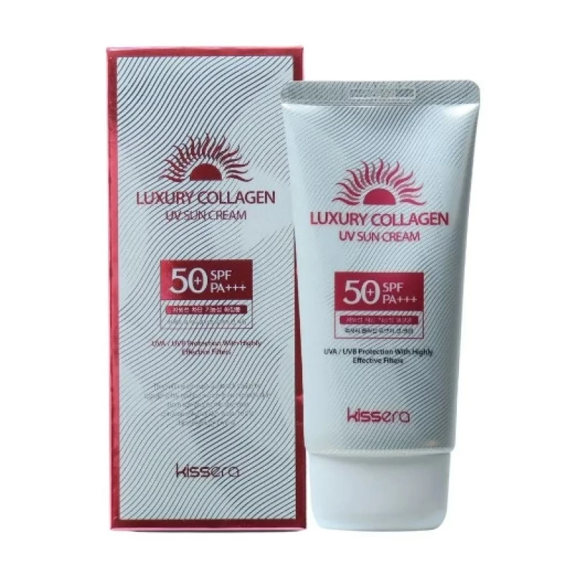 كريم الشمس الفاخر بالكولاجين واقي شمس من ماركة كيسيرا الكورية، تركيبة ناعمة على البشرة غنية بالكولاجين، ترطب و تحمي البشرة من اشعة الشمس بعامل حماية 50 و الأشعة فوق البنفسجية الطويلة والمتوسطة.