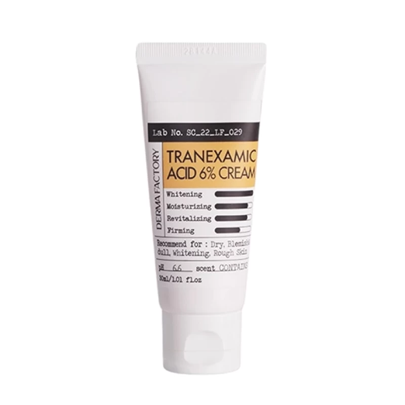 كريم حمض الترانكساميك 6% من ماركة ديرمافاكتوري الكورية، المميزات: - يساهم في تفتيح وتوحيد لون البشرة. - تركيبة فعالة لمظهر أكثر إشراقًا. - مناسب لجميع أنواع البشرة.