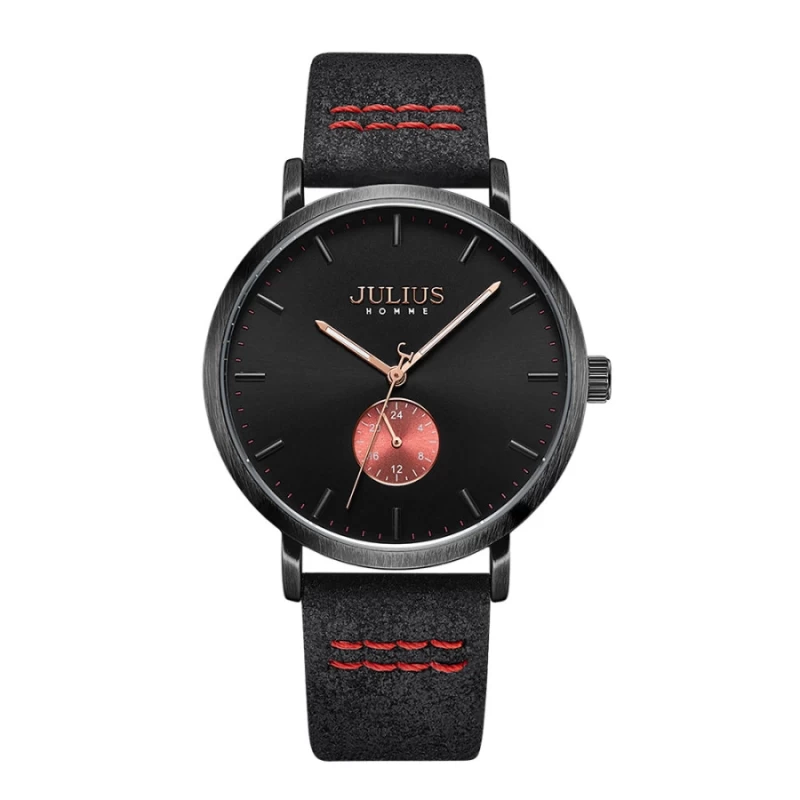 ساعات جوليوس رقم 1 الكورية، أشهر علامة تجارية لساعات اليد العصرية في كوريا. تصميمها رائع وتنوعها متنوع. دعي الفتيات يستمتعن باختيار ساعات جوليوس المتناسقة لإكمال إطلالتهن، لتكوني جميلة وأنيقة وعصرية على الطراز الكوري. جودة لا تضاهى، مما يساعدكِ على التميز. عززي ثقتكِ في كل فرصة. المواصفات:- • عرض السوار: 20 ملم • السماكة: 10 ملم • نوع القرص: أنالوج (عقارب) • مناسب لـ: الرجال • نوع الحركة: كوارتز • الحركة: يابانية من نوع MIYOTA • مادة السوار: جلد • مادة العلبة: سبيكة معدنية (Alloy) • مادة المشبك: فولاذ مقاوم للصدأ • شكل القرص: دائري • نوع التاج (Crown): لولبي (Screw-down Crown) • نوع الزجاج: زجاج معدني