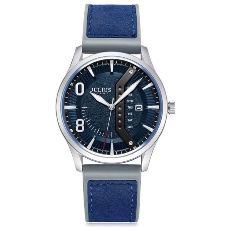 ساعات جوليوس من افضل براندات الساعات الكورية، ومن أشهر علامة تجارية لساعات اليد العصرية في كوريا. تصميمها رائع وتنوعها واسع. دع الناس تتكلم عن ساعتك. ساعات جوليوس المتناسقة لإكمال إطلالتك، لتكون جميلة وأنيقة وعصرية على الطراز الكوري. جودة لا تضاهى، مما يساعدكِ على التميز. المواصفات:- • مادة السوار: جلد مطاطي كوري أزرق • الزجاج: شفاف وعالي الصلابة • نوع المشبك: زر ضغط (Push button) • مادة العلبة: سبيكة سوداء مطلية بتقنية الطلاء الأيوني (Ion-plated) • الحركة: كوارتز يابانية عالية الدقة • مقاومة الماء: حتى 30 مترًا (3ATM) • التصميم: سوار مطاطي أزرق، قرص أبيض، وعلبة فضية