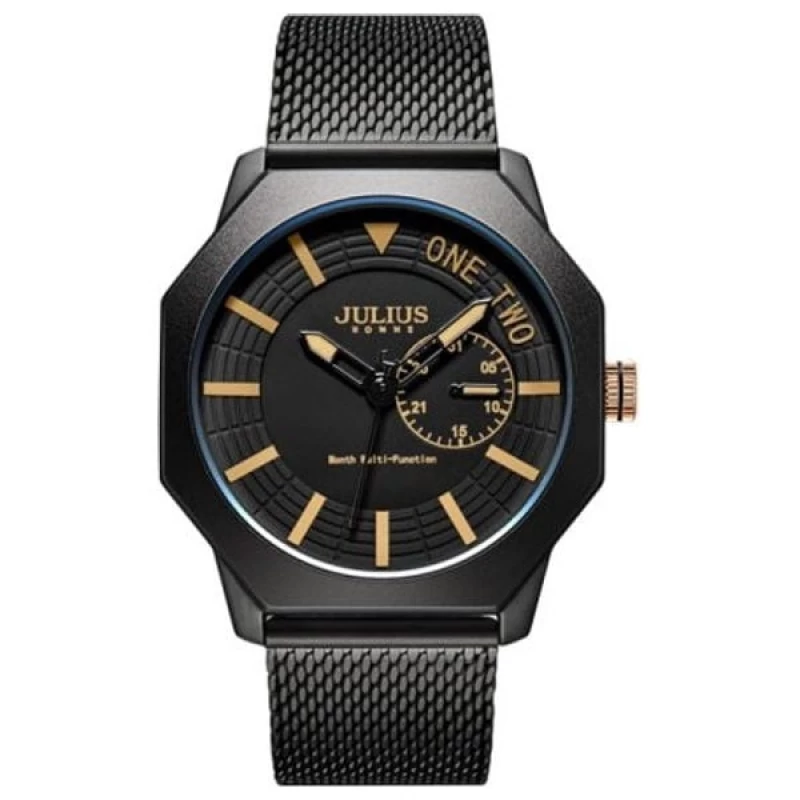 ساعات جوليوس من افضل براندات الساعات الكورية، ومن أشهر علامة تجارية لساعات اليد العصرية في كوريا. تصميمها رائع وتنوعها واسع. دع الناس تتكلم عن ساعتك. ساعات جوليوس المتناسقة لإكمال إطلالتك، لتكون جميلة وأنيقة وعصرية على الطراز الكوري. جودة لا تضاهى، مما يساعدكِ على التميز. المواصفات:- • العلامة التجارية / المجموعة: JULIUS HOMME • التصميم: تصميم كوري • رقم الموديل: JAH-126A, B, C, D • الجنس: رجالي • مادة زجاج القرص: زجاج معدني • ألوان القرص: فضي، رمادي، أزرق، أسود • حجم العلبة: 41 ملم • شكل العلبة: دائري • ألوان العلبة: فضي، رمادي، أسود • مادة العلبة: فولاذ مقاوم للصدأ • سماكة العلبة: 10 ملم • مادة السوار: فولاذ مقاوم للصدأ • عرض السوار: 22 ملم • ألوان السوار: فضي، رمادي، أسود • نوع المشبك: مشبك انزلاقي (Sliding Buckle Clasp) • الحركة: حركة كوارتز يابانية VH65 متعددة الوظائف (Time Module) • مقاومة الماء: 3ATM نعم