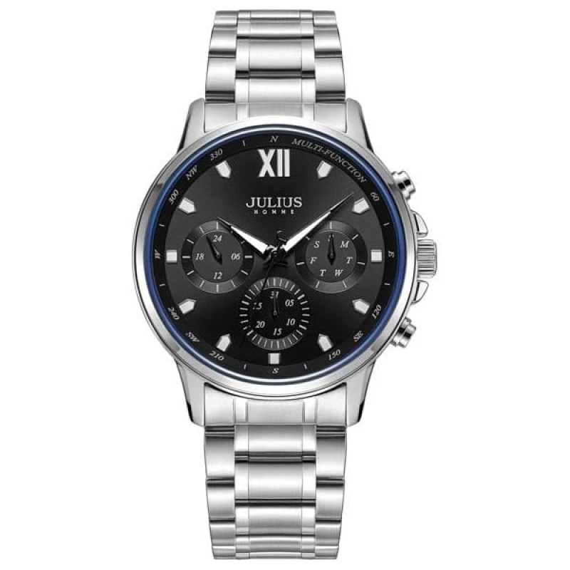 ساعات جوليوس من افضل براندات الساعات الكورية، ومن أشهر علامة تجارية لساعات اليد العصرية في كوريا. تصميمها رائع وتنوعها واسع. دع الناس تتكلم عن ساعتك. ساعات جوليوس المتناسقة لإكمال إطلالتك، لتكون جميلة وأنيقة وعصرية على الطراز الكوري. جودة لا تضاهى، مما يساعدكِ على التميز. المواصفات:- • الوصف: ساعة دائرية باللون الفضي مع سوار فضي من الفولاذ المقاوم للصدأ وقرص أسود • مادة السوار: فولاذ مقاوم للصدأ • مادة الزجاج: زجاج معدني شفاف عالي الجودة، مقاوم للصدمات • حجم الواجهة: 4.1 سم (قرص دائري) • سماكة الساعة: 1 سم • الطول الكلي: 23 سم • عرض السوار: 2 سم • نوع المشبك: مشبك قابل للطي (Deployant Clasp) • مادة العلبة: مطلية بسبيكة معدنية (Alloy Coating) • الحركة: كوارتز يابانية • مقاومة الماء: (مناسبة للأمطار وغسل اليدين)