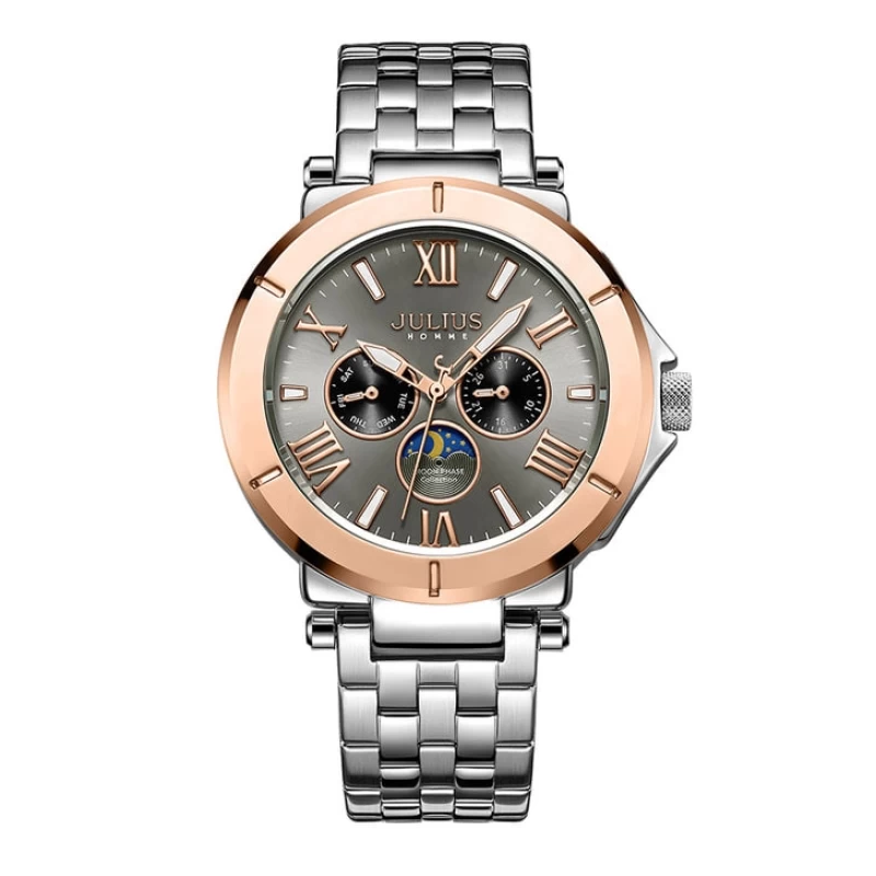 ساعات جوليوس رقم 1 الكورية، أشهر علامة تجارية لساعات اليد العصرية في كوريا. تصميمها رائع وتنوعها متنوع. دعي الفتيات يستمتعن باختيار ساعات جوليوس المتناسقة لإكمال إطلالتهن، لتكوني جميلة وأنيقة وعصرية على الطراز الكوري. جودة لا تضاهى، مما يساعدكِ على التميز. عززي ثقتكِ في كل فرصة. المواصفات:- • مادة السوار: فولاذ مقاوم للصدأ • مادة الزجاج: زجاج معدني شفاف عالي الجودة • حجم الواجهة: 4.2 سم (قرص دائري) • السماكة: 1 سم • الطول الكلي: 23 سم • عرض السوار: 2 سم • نوع المشبك: مشبك زر ضاغط (Push button) • الحركة: كوارتز من نوع Time Module VX3H • مقاومة الماء: نعم