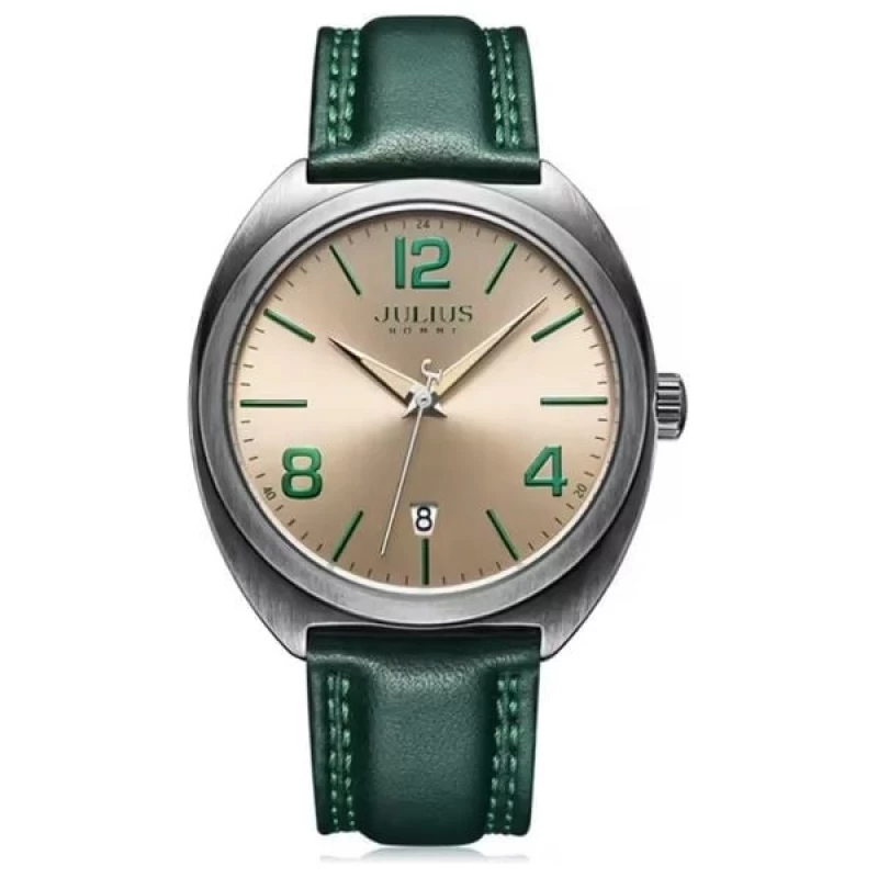 ساعات جوليوس من افضل براندات الساعات الكورية، ومن أشهر علامة تجارية لساعات اليد العصرية في كوريا. تصميمها رائع وتنوعها واسع. دع الناس تتكلم عن ساعتك. ساعات جوليوس المتناسقة لإكمال إطلالتك، لتكون جميلة وأنيقة وعصرية على الطراز الكوري. جودة لا تضاهى، مما يساعدكِ على التميز. المواصفات:- • آلية الحركة: كوارتز يابانية • مادة العلبة: ورق • مادة السوار: جلد • مادة القرص: هاردليكس (Hardlex) • الشكل: دائري • الوظائف: عرض التاريخ التلقائي، مقاومة الماء • نوع المشبك: إبزيم (Pin Buckle) • قطر القرص: 41 ملم • سماكة العلبة: 9 ملم • عرض السوار: 20 ملم • طول السوار: 22 سم • اللون: رمادي مع سوار جلدي أخضر وقرص أصفر وأخضر • مقاومة الماء: نعم