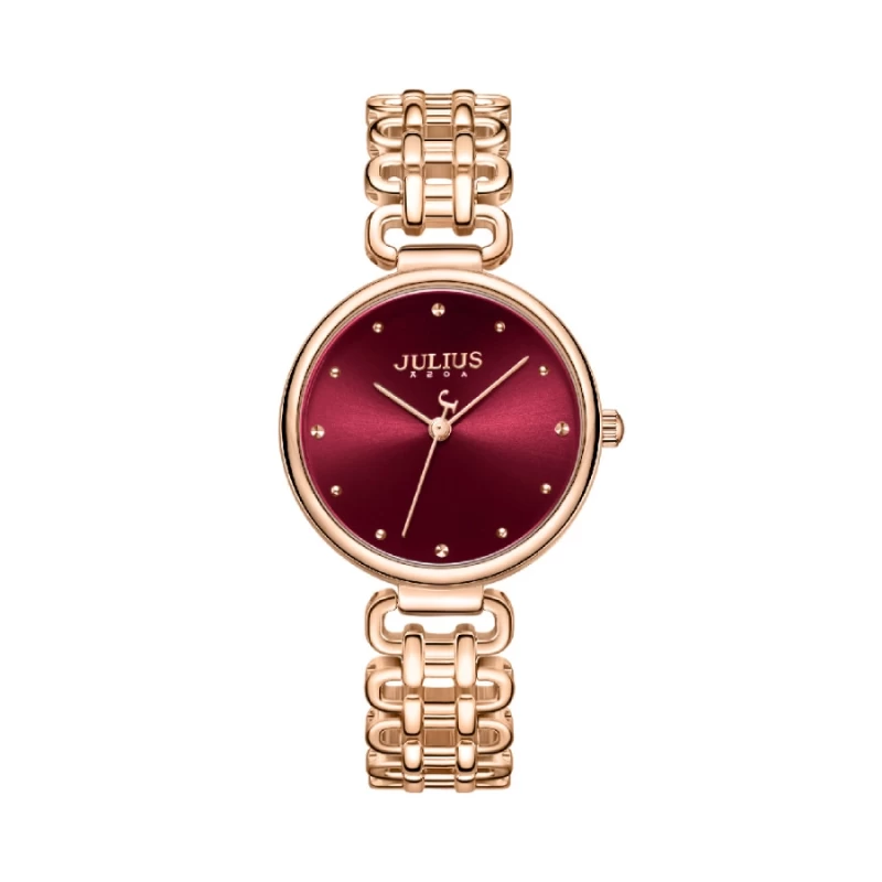 ساعات جوليوس من افضل براندات الساعات الكورية، ومن أشهر علامة تجارية لساعات اليد العصرية في كوريا. تصميمها رائع وتنوعها واسع. دع الناس تتكلم عن ساعتك. ساعات جوليوس المتناسقة لإكمال إطلالتك، لتكون جميلة وأنيقة وعصرية على الطراز الكوري. جودة لا تضاهى، مما يساعدكِ على التميز. المواصفات:- • زجاج القرص: زجاج معدني • العلبة: فولاذ مقاوم للصدأ • السوار: فولاذ مقاوم للصدأ • الحركة: كوارتز يابانية VX33 • مقاومة الماء: 3ATM • حجم العلبة: 30 ملم • سماكة العلبة: 8 ملم • عرض السوار: 14 ملم • نوع المشبك: مشبك (Clasp) • اللون: ماروني • علبة: علبة جوليوس الفاخره مع حقيبة ورقية