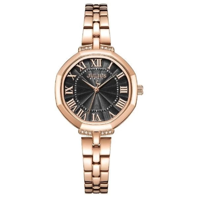ساعات جوليوس من افضل براندات الساعات الكورية، ومن أشهر علامة تجارية لساعات اليد العصرية في كوريا. تصميمها رائع وتنوعها واسع. دع الناس تتكلم عن ساعتك. ساعات جوليوس المتناسقة لإكمال إطلالتك، لتكون جميلة وأنيقة وعصرية على الطراز الكوري. جودة لا تضاهى، مما يساعدكِ على التميز. المواصفات:- • الحركة: كوارتز يابانية من نوع Miyota • حجم القرص: 28 ملم • مقاس السوار: • الطول: 180 ملم • العرض: 8 ملم • المادة: • السوار: فولاذ مقاوم للصدأ • المشبك: مشبك زر ضغط (Push button clasp) • اللون: • السوار: فولاذ باللون الذهبي الوردي • القرص: أسود • مقاومة الماء: 3 ATM رذاذ