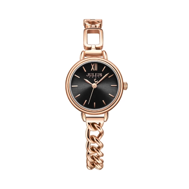 ساعات جوليوس من افضل براندات الساعات الكورية، ومن أشهر علامة تجارية لساعات اليد العصرية في كوريا. تصميمها رائع وتنوعها واسع. دع الناس تتكلم عن ساعتك. ساعات جوليوس المتناسقة لإكمال إطلالتك، لتكون جميلة وأنيقة وعصرية على الطراز الكوري. جودة لا تضاهى، مما يساعدكِ على التميز. المواصفات:- • مادة السوار: فولاذ مقاوم للصدأ • حجم القرص: 25 ملم • طول السوار: 180 ملم • عرض السوار: 8 ملم • نوع المشبك: مشبك قابل للطي (Deployment clasp) • الخامة: عالية الجودة مع قرص أسود • الحركة: كوارتز يابانية من نوع Miyota • مقاومة الماء: ATM • الوصف: ساعة كورية باللون الذهبي الوردي مع قرص أسود