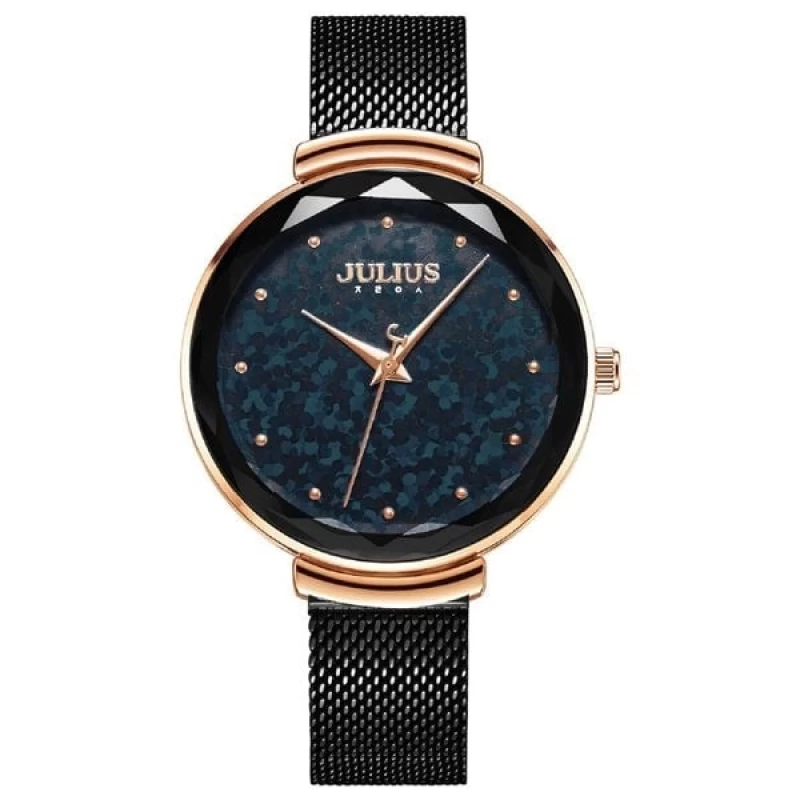 ساعات جوليوس من افضل براندات الساعات الكورية، ومن أشهر علامة تجارية لساعات اليد العصرية في كوريا. تصميمها رائع وتنوعها واسع. دع الناس تتكلم عن ساعتك. ساعات جوليوس المتناسقة لإكمال إطلالتك، لتكون جميلة وأنيقة وعصرية على الطراز الكوري. جودة لا تضاهى، مما يساعدكِ على التميز. المواصفات:- • آلية الحركة: كوارتز Miyota • الزجاج: معدني عضوي شفاف ومقاوم للصدمات • حجم القرص: 35 ملم • السوار: فولاذ مقاوم للصدأ بتصميم مضفر مع مشبك • طول السوار: 210 ملم • عرض السوار: 13 ملم • لون القرص: أزرق • لون السوار: أسود • مقاومة الماء: نعم