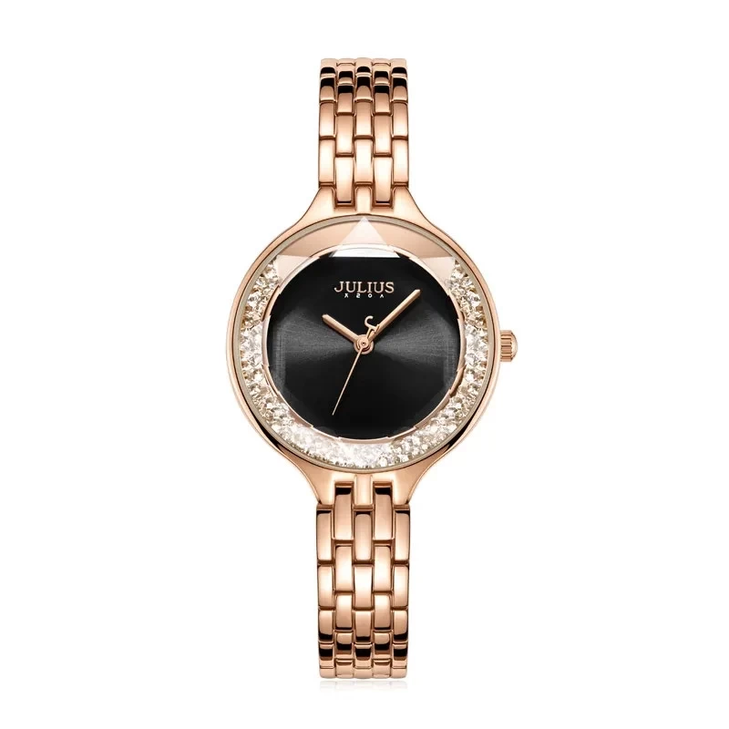 ساعات جوليوس من افضل براندات الساعات الكورية، ومن أشهر علامة تجارية لساعات اليد العصرية في كوريا. تصميمها رائع وتنوعها واسع. دع الناس تتكلم عن ساعتك. ساعات جوليوس المتناسقة لإكمال إطلالتك، لتكون جميلة وأنيقة وعصرية على الطراز الكوري. جودة لا تضاهى، مما يساعدكِ على التميز. المواصفات:- • شكل الساعة: دائري • مادة العلبة: سبيكة مطلية • مادة السوار: فولاذ مقاوم للصدأ باللون الذهبي الوردي • مادة الزجاج: زجاج ثلاثي الأبعاد بتصميم متألق • لون القرص: أسود • الحركة: كوارتز يابانية • التجميع: مُجمعة في الصين لتقليل التكاليف الأبعاد: • قطر القرص: 3.2 سم • السماكة: 0.8 سم • عرض السوار: 14 ملم • الطول الكلي للسوار: 22 سم • مقاومة الماء: نعم