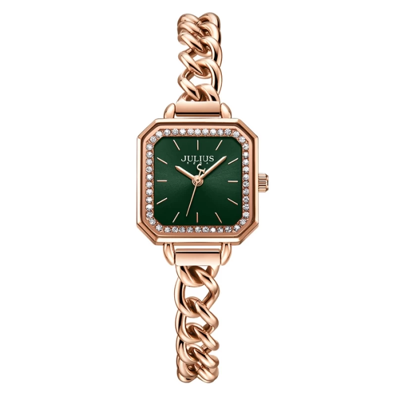 ساعات جوليوس من افضل براندات الساعات الكورية، ومن أشهر علامة تجارية لساعات اليد العصرية في كوريا. تصميمها رائع وتنوعها واسع. دع الناس تتكلم عن ساعتك. ساعات جوليوس المتناسقة لإكمال إطلالتك، لتكون جميلة وأنيقة وعصرية على الطراز الكوري. جودة لا تضاهى، مما يساعدكِ على التميز. المواصفات:- شكل العلبة: مربع • لون القرص: أخضر • السوار: فولاذ مقاوم للصدأ بلون ذهبي • مادة العلبة: سبيكة مطلية • الزجاج: زجاج معدني عالي الجودة • الحركة: كوارتز يابانية • مقاومة الماء: حتى 30 مترًا المقاسات: • حجم العلبة: 2.8 سم • السماكة: 0.8 سم • طول السوار: 22 سم • المقاس المناسب للمعصم: مقاس 12