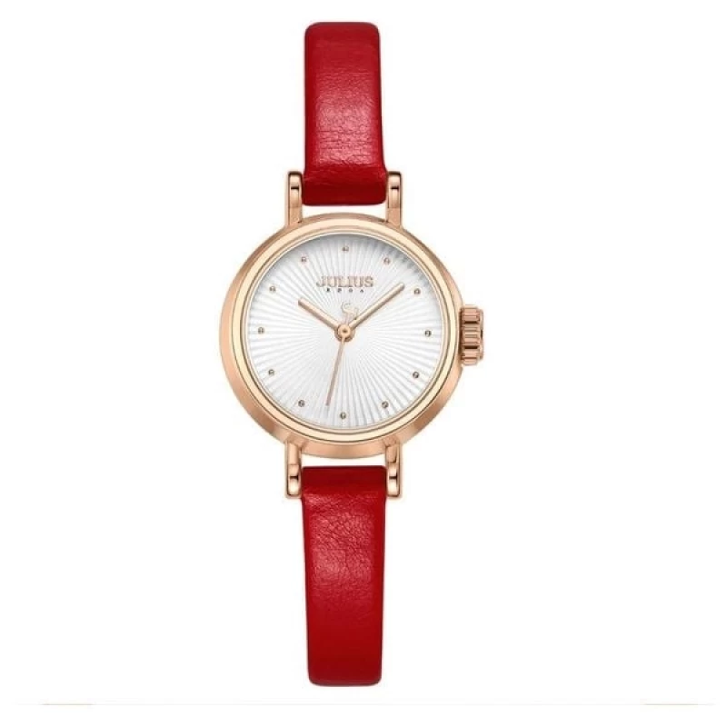 ساعات جوليوس من افضل براندات الساعات الكورية، ومن أشهر علامة تجارية لساعات اليد العصرية في كوريا. تصميمها رائع وتنوعها واسع. دع الناس تتكلم عن ساعتك. ساعات جوليوس المتناسقة لإكمال إطلالتك، لتكون جميلة وأنيقة وعصرية على الطراز الكوري. جودة لا تضاهى، مما يساعدكِ على التميز. المواصفات:- • مادة السوار: جلد • مادة الزجاج: زجاج معدني عالي الجودة وشفاف • حجم المينا: 23.5 ملم • عرض السوار: 12 ملم • مادة العلبة: سبيكة (Alloy) • آلية الحركة: كوارتز ياباني • مقاومة الماء: نعم