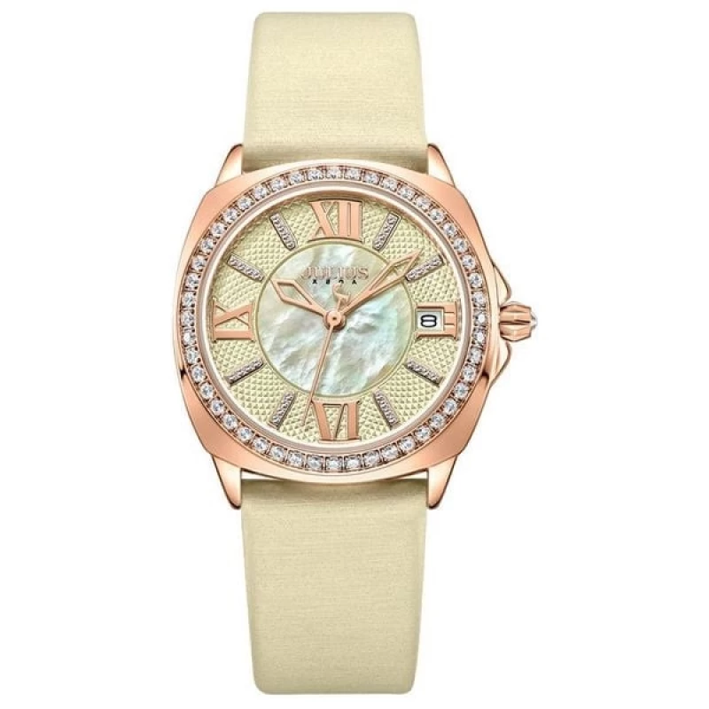 ساعات جوليوس من افضل براندات الساعات الكورية، ومن أشهر علامة تجارية لساعات اليد العصرية في كوريا. تصميمها رائع وتنوعها واسع. دع الناس تتكلم عن ساعتك. ساعات جوليوس المتناسقة لإكمال إطلالتك، لتكون جميلة وأنيقة وعصرية على الطراز الكوري. جودة لا تضاهى، مما يساعدكِ على التميز. المواصفات:- • مادة السوار: سوار من جلد المِلك مع قرص دائري باللون الأخضر الفاتح ووظيفة عرض التاريخ • مادة الزجاج: زجاج معدني عالي الجودة • شكل الوجه: دائري • حجم القرص: 32 ملم • السماكة: 8 ملم • الطول الكلي: 24 سم • عرض السوار: 18 ملم • الإطار: مرصع بأحجار الراين • نوع المشبك: مشبك قابل للطي (Deployment clasp) • مادة العلبة: سبيكة لامعة بطلاء فراغي بتقنية IP • الحركة: كوارتز يابانية Miyota (من مجموعة Citizen اليابانية) • الإضاءة: غير متوفرة • مصدر الطاقة: بطارية • مقاومة الماء: حتى 30 مترًا (3ATM) مميزات إضافية: • قرص بتصميم صدف اللؤلؤ (Mother of Pearl) • وظيفة عرض التاريخ • إطار مرصع بأحجار الراين