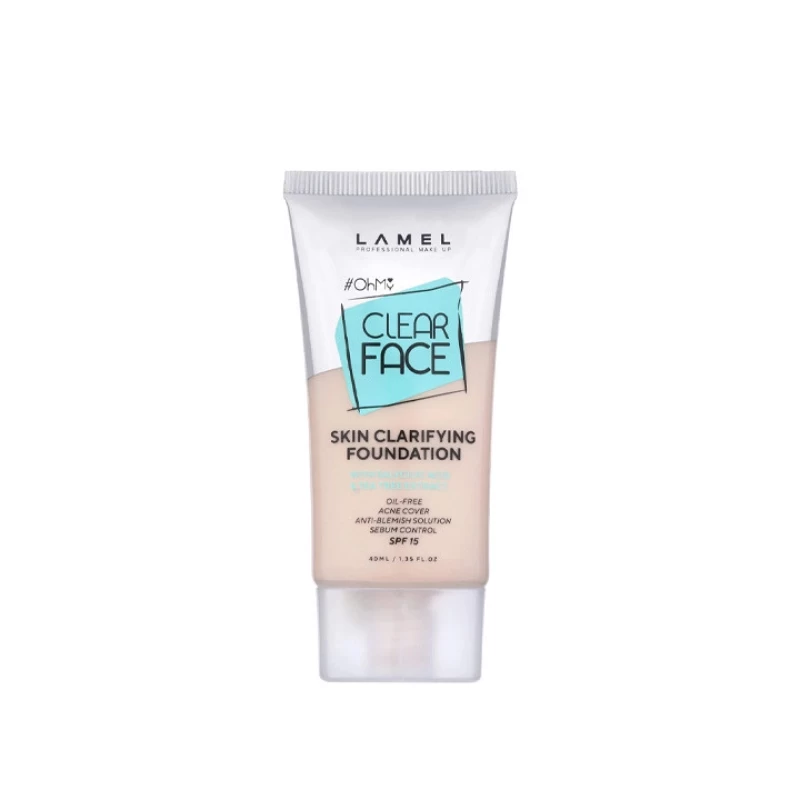 فاونديشن كلير فيس لتنقية البشرة من ماركة لاميل البريطانية، المميزات : - يقدم حماية من الشمس بعامل حماية SPF 15. - يجمع بين تحسين مظهر البشرة والعناية بها، مما يجعله مثالياً للبشرة المعرضة لحب الشباب. - يحتوي على حمض الساليسيليك الذي يساعد في تنظيف المسام وتقليل ظهور البثور. - يحتوي على خلاصة شجرة الشاي التي توفر خصائص مهدئة ومضادة للبكتيريا. - يوفر مظهراً خالياً من الزيوت طوال اليوم.مكياج