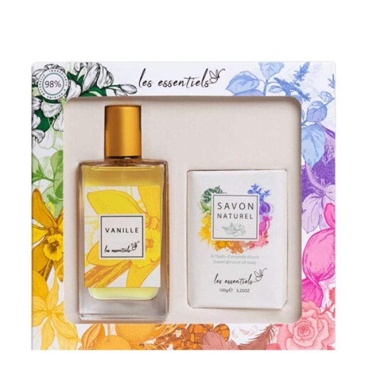 سيت عطر فانيلا + صابونة من ماركة Les Essentiels الفرنسية، يتكون من - عطر فانيلا ، عطر زهري بمكونات طبيعية 97% بثباتية تدوم طويلاً بسعة 80 مل. - صابونة بقاعدة نباتية من مكونات طبيعية 98% غنية بزيت اللوز الحلو تغذي البشرة وتحافظ عليها بوزن 100 غم.